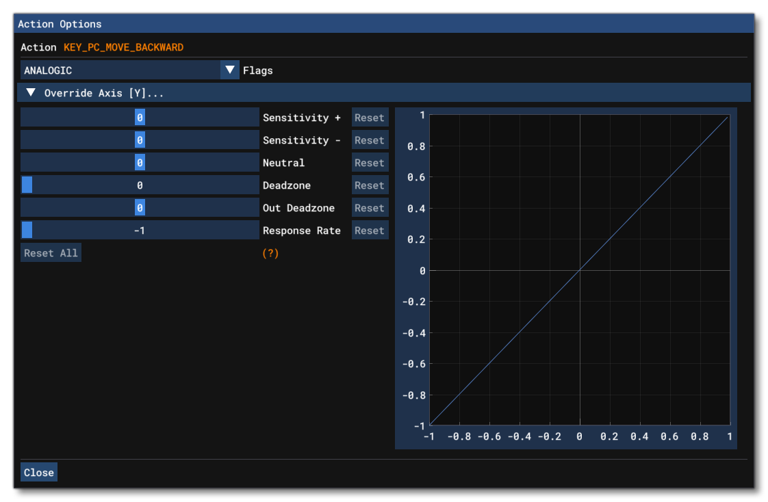 This option allows you to set overrides for the various analogue axis response curves on a global level (ie: changes made here will change axis input response for all actions using that input). Selecting the option will open a small window asking you to select the axis to override: