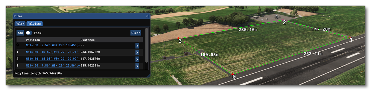 This tab is used to generate a "polyline" consisting of various capture positions, and then show the distances between them. The default behavior is to move the camera to the position to measure from and then click the Add button, then move the camera again and click Add again, repeating this until you have all the points added that you want to get the distances between: