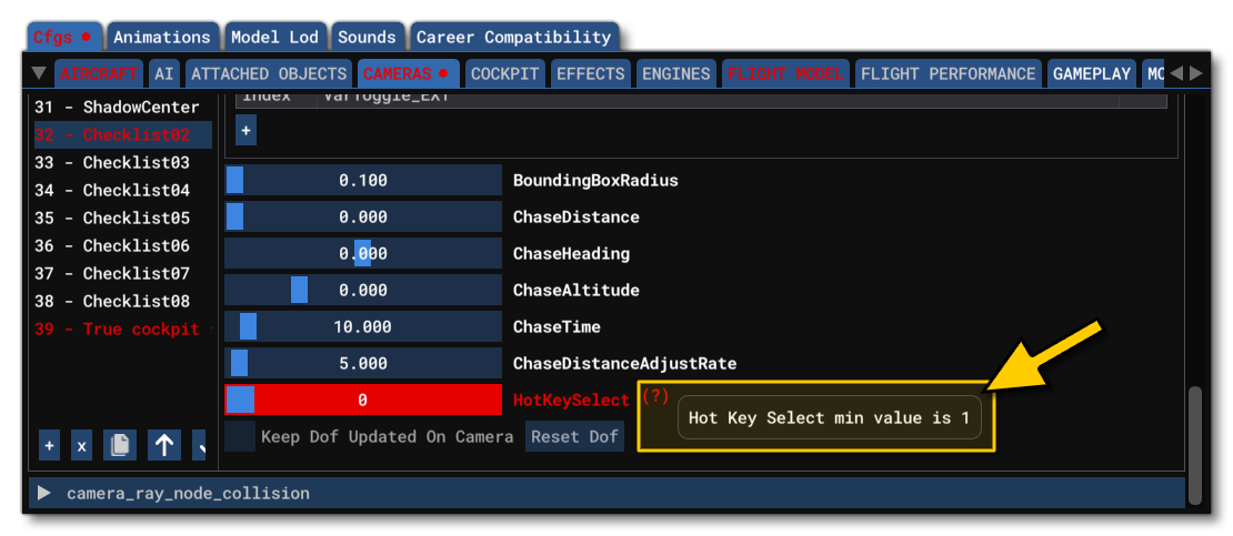 When this option is checked, the SimObject Editor will be in "debug" mode, meaning that all parameters will be checked against an internal database, and the values they contain will also be checked to ensure they fall between the acceptable min/max, or have a correct default value, or even if they should be present based on other parameters in the file (for example, some parameters should not exist if the file or section version is not high enough). In those cases, the file, section, and parameter(s) will be highlighted in red, and there will be an exclamation mark shown, which can be moused over to get information about the error: