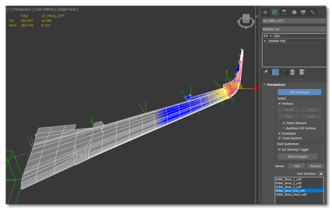 Now we have all the helpers we need to skin the main part of the wing. For that we need to select all your helpers along with the wing's node. We recommend that you isolate them to have a clean viewport. Next, we select our wing and add a skin modifier, and to that we add all the helpers we've created to "Bones" in the modifier. We also set the bone affect limit to 4, and check "Show No Envelopes":
