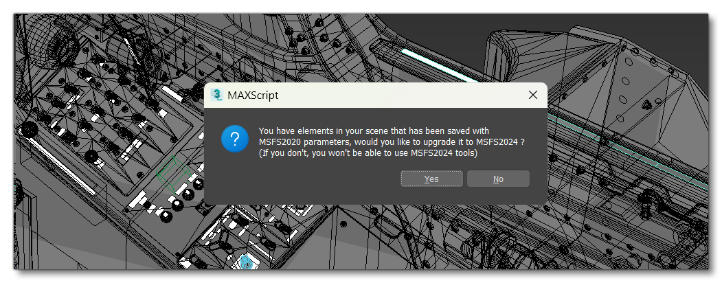 On this window you should click the Yes button and the update process will begin and requires a few seconds or more (depending on the complexity of the project). If you don't wish to update just yet - because you want to tweak the model or change some animation groups, etc... - then you can click the No button, and then at a later time convert the project using the Convert 3DS Max Scene To MSFS2024 option in the 3DS Max plugin menu.