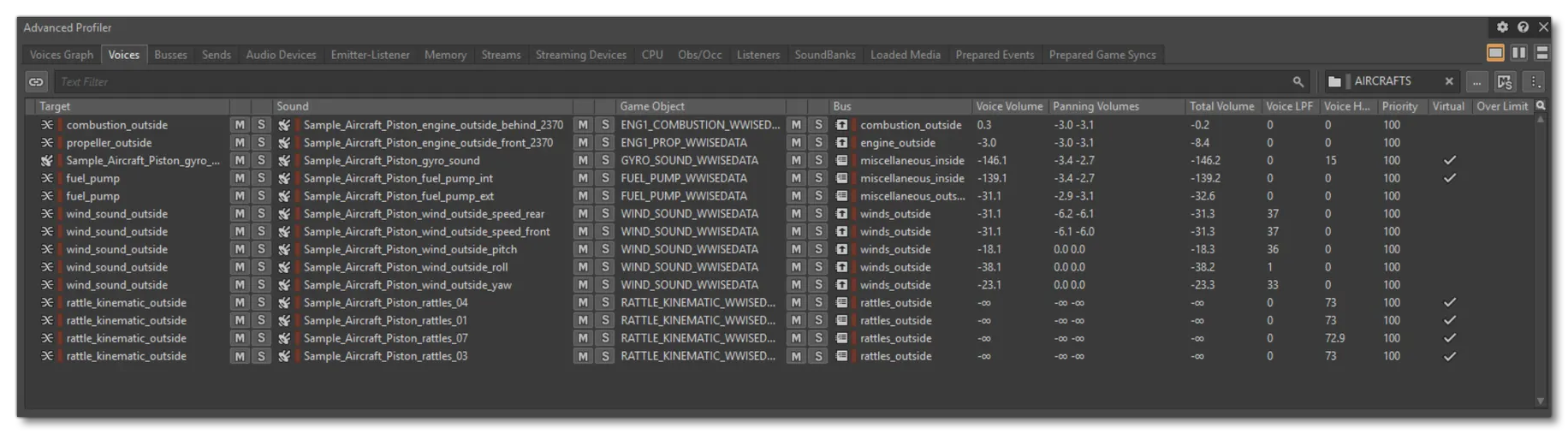To examine the performance of your implementation in greater detail, you can consult the Advanced Profile window/tab to see which sources are being read, which sources are virtual or physical, which ones are unnecessary, and which sources are the most recurrent, in order to optimise accordingly. Note that at the top right of the advanced profiler, you have a filter which can be used to reduce the hierarchy to display only the sounds from your aircraft.