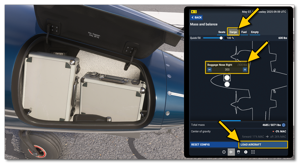You can use the EFB to spawn / despawn the loads on your aircraft. This is done from the Flight Performances section of the aircraft app, in the Mass and Balance section. In this section you can go to the Cargo tab, and in that tab click on the node you want to add cargo to and then set the amount. Once set, simply click on theLoad Aircraftbutton to add the loads to the aircraft: