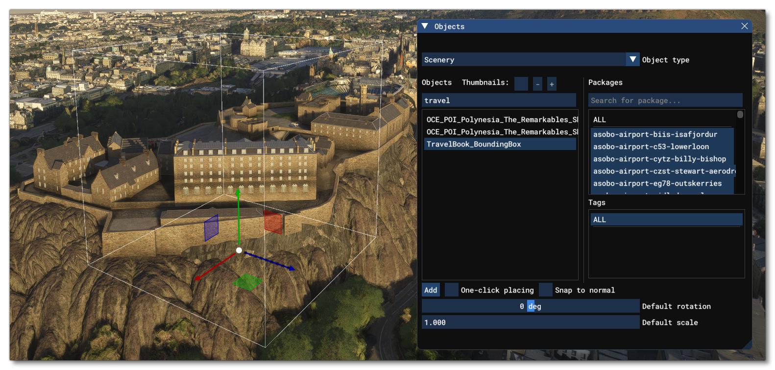 To start with, we open the asset group in the Scenery Editor and then navigate to Edinburgh Castle. Once there we select the TravelBook_BoundingBox object and add it into the world, adjusting it's size and position using the Edition Gizmo: