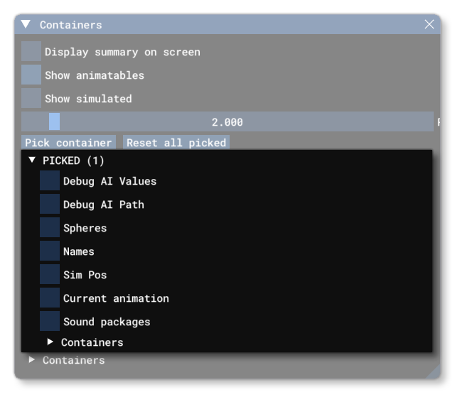 The options at the top are "global" options that will enabled or disable various debug tools for all the picked containers. These options are listed below, but note that not all category of SimObject container will have all these options:
