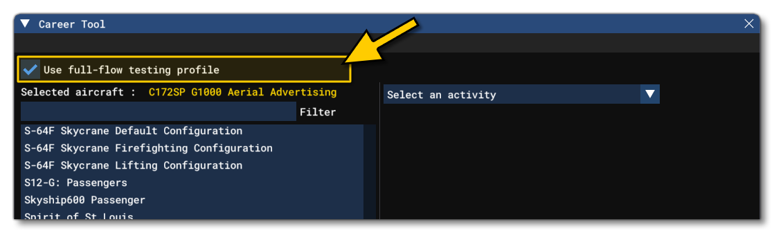 When this option is checked, the next time you enter Career Mode, the simulation will load a Flight Simulator developer save which has everything unlocked. This safe is seperate to the "retail" save file, and permits the testing of your aircraft in the "full flow" of the simulation career mode. The save will give you a large sum of money with which to buy aircraft, and will also unlock all the different career certifications, companies, and missions.