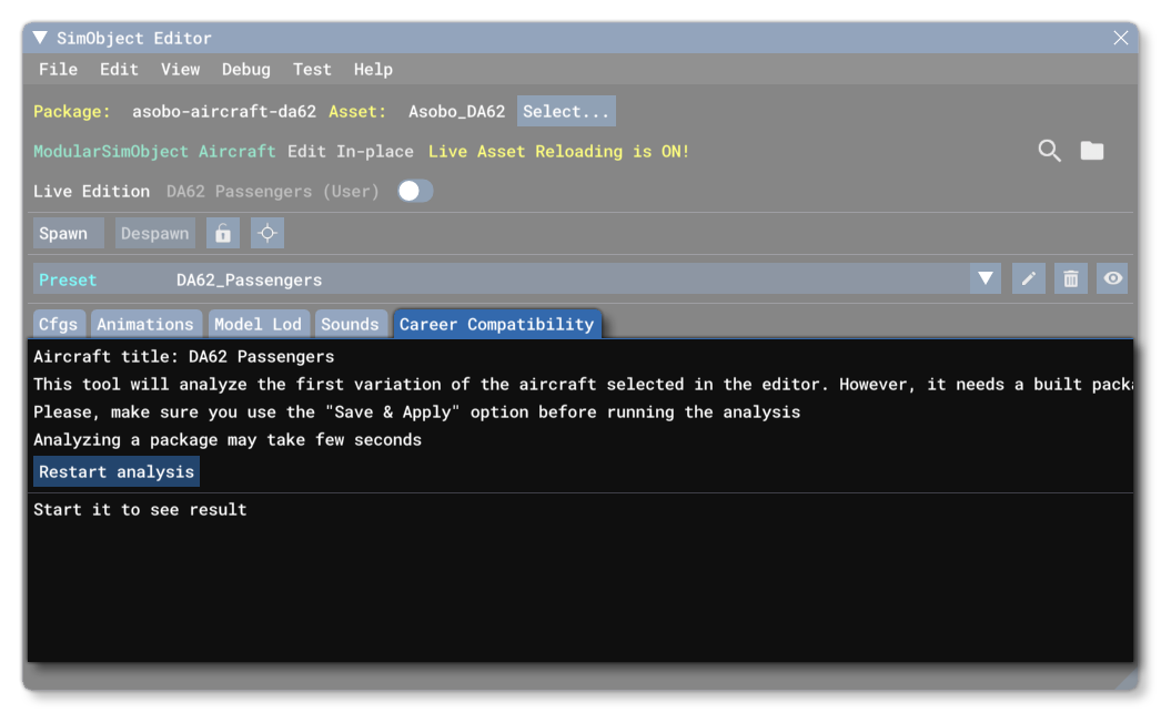 The career compatibility will require you to select one of the aircraft Presets that you have set up before it can be used. It will also require you to Build the aircraft so that files like the model glTF or the parameter CFGs can be properly parsed in the context of the preset that has been selected. Once you have built the aircraft and selected the preset, you can click the Restart Analysis button to begin the analysis process, which may take a minute or so, depending on the complexity of the aircraft. When finished you will have a number of new tabs in the window showing information about the career compatibility analysis: