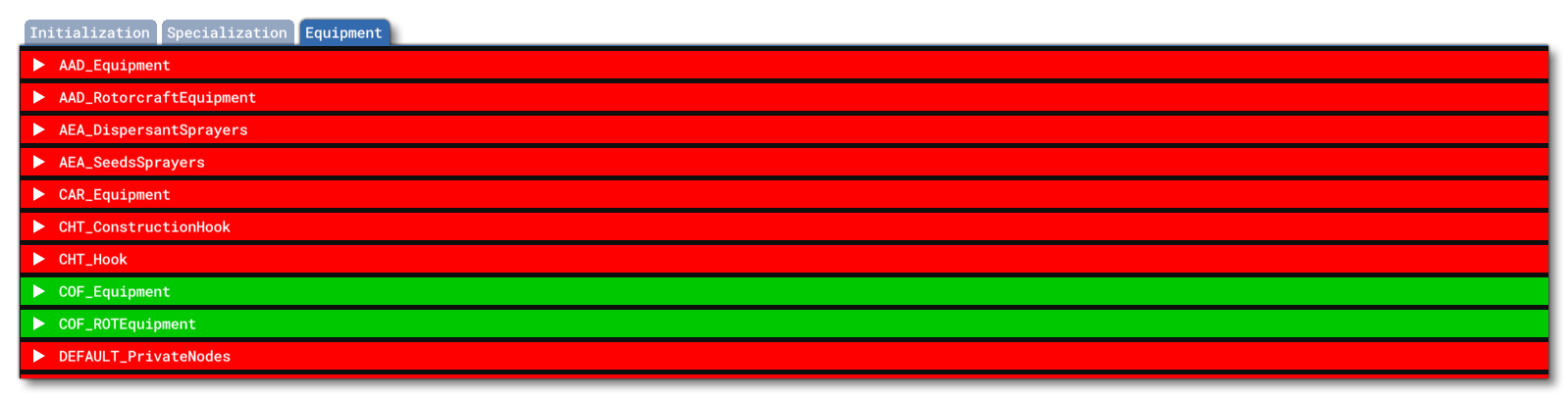 The equipment tab is used to check whether the aircraft has the necessary equipment to perform specific career missions, things like seat number and tags, nodes in the glTF files, type of landing gear, etc... Each of the different career equipment listed will be given using it's Cabin Code and will be colour coded after running the compatibility analysis: red for an issue, and green for the aircraft being all good.