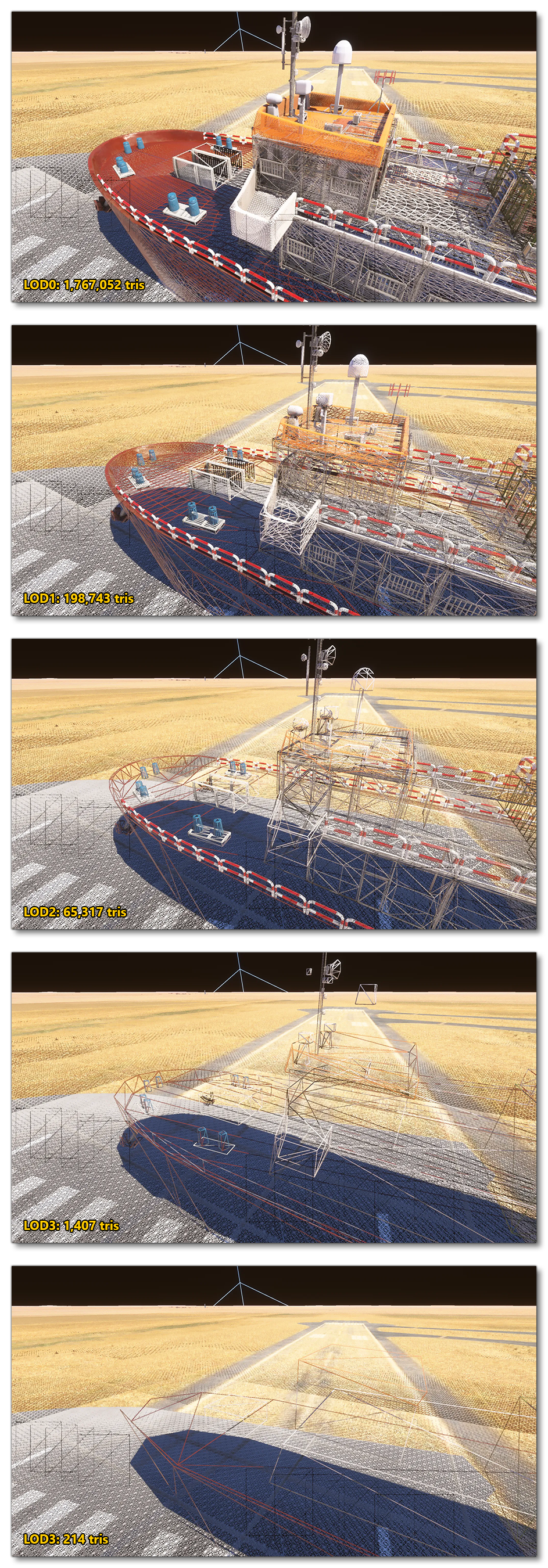 Due to the careful and well crafted LODs for this massive model, the simulation can handle multiple instances of the model in any given scene without issue, and yet visually everything looks great even though the model has been drastically reduced in detail each LOD (especially from LOD0 to LOD1). The lods for this model were created using the LOD Technical Information, which boils down to: