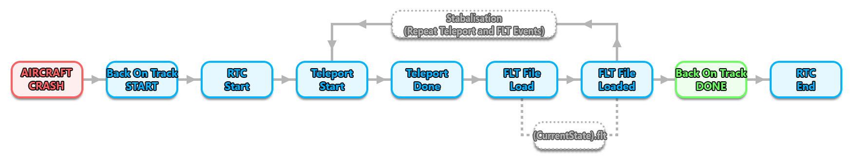 When a user is in free flight, a back-on-track can only be triggered by the aircraft crashing, generating a FsFlowEvent_PlaneCrash event, and then a series of other events as the aircraft is teleported, stabalised and the cruise.flt is loaded. The full flow is as follows: