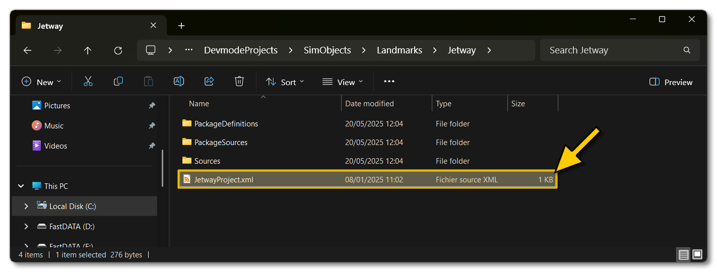 In order to load and build the project in Microsoft Flight Simulator 2024, you must have previously enabled Developer Mode (see here for more information). A jetway cannot exist on it's own and is linked to other simulation objects, specifically an Airport and a Parking Spot, so you'll need to do a few extra steps before you can see it in the simulation.