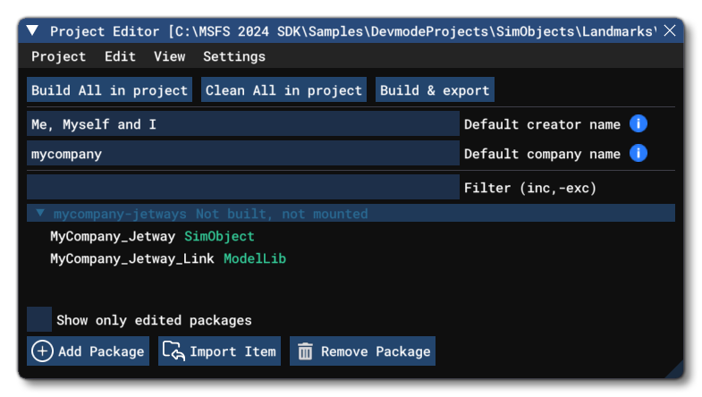 • Selecting the project and then right-clicking will open a menu where you can select the Build and Mount option to build the project and mount the created package in the VFS: