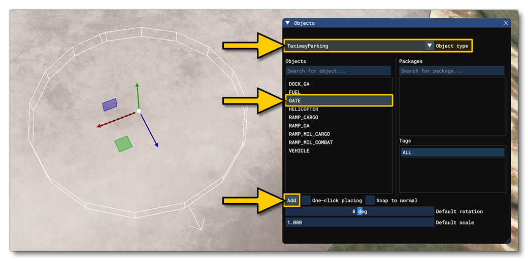 • Now that the package has been built you need to open The Scenery Editor, so we can spawn the jetway objects from this sample in the simulation to see how they look. In the Scenery Editor, open the Objects window and first add an Airport Object, since jetways can only be placed on an airport. Now, if you try to add the jetway at this point you'll still get an error, as it also requires a parking spot. So, in the Objects window, from the Object Type drop down list, select the option TaxiwayParking, then select one of the gate types, then click the Add button (jetways can only be associated with Gate parking). This will add a taxiway parking spot to the airport (the actual location isn't important for this example).
