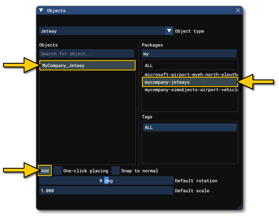 • Now, you can select the Jetway Objects in the Objects window, and if you filter the list to the package you've just built, you should see "MyCompany-Jetway", which is the jetway sample package you built at the start. As before, click the Add button to add it to the airport.